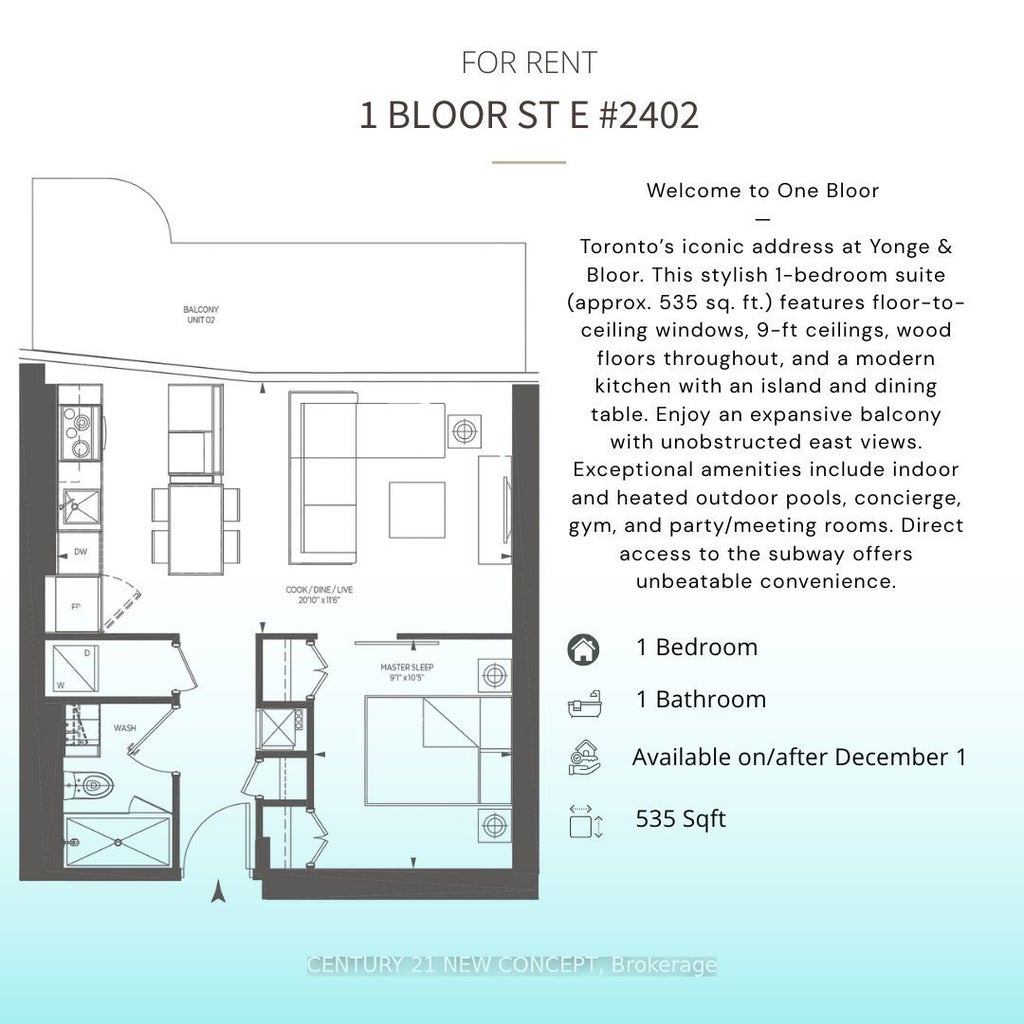 Welcome to One Bloor. Toronto's most iconic address at Yonge & Bloor. This stunning 1-bedroom suite offers approx. 535 sq. ft. of thoughtfully designed living space with floor-to-ceiling windows, soaring 9 ft ceilings, and wood flooring throughout. Enjoy an unobstructed east-facing view from the expansive balcony, perfect for morning coffee or evening relaxation. The sleek, modern kitchen features a built-in island with a dining extension, ideal for both everyday living and entertaining. Residents enjoy world-class amenities including indoor and heated outdoor pools, a fully equipped gym, party/meeting rooms, and 24-hour concierge service. Direct subway access connects you seamlessly to the entire city. Experience luxury living in the heart of Toronto.