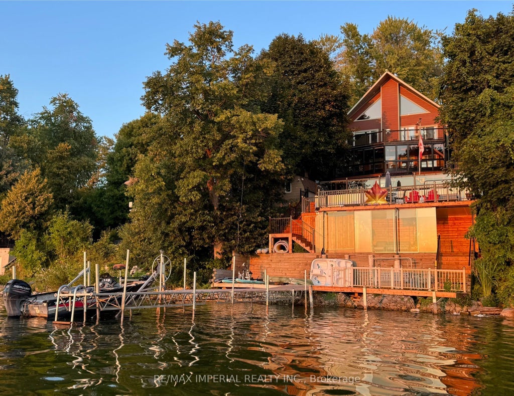 One-of-a-kind chalet-style waterfront home on Lake Scugog! Premium swimmable hard-sand shoreline with breathtaking sunsets & direct access to the Trent-Severn Waterway. Year-round fun fishing, paddle boarding, swimming & snowmobiling! Quality craftsmanship throughout: vaulted ceilings, exposed beams, hardwood floors & open-concept main level. Family room & dining room feature soaring 18-ft ceilings with walk-out to lakeview deck. Newly completed 4-level decks lead from the backyard down to the private dockperfect for BBQs, entertaining, exercise or relaxing at sunset. Main floor includes a convenient bedroom. Loft rec room w/catwalk captures panoramic views. Lower level offers a gas fireplace, sunroom walk-out, primary w/heated ensuite, 2 more bedrooms & 6-pc bath. Finished 340 sq ft walkout basement with 5th bedroom & sep entrance. Additional features: Drilled Well (2022), Natural Gas on street & Fibre Optic Internet. A rare lakeside retreat!