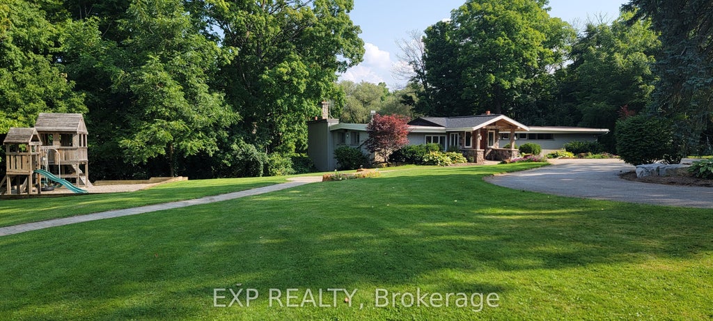 Welcome to 6165 19th Ave., Markham a truly unique country estate offering the best of both worlds: ultimate privacy and serene natural surroundings, all within minutes to modern conveniences. This warm and inviting 4-bedroom, 4-bathroom bungalow inspired by Frank Lloyd Wrights signature style is thoughtfully integrated into the landscape. Floor-to-ceiling windows along the back of the home flood the interior with natural light and provide breathtaking views of the wooded rolling lot and creek. The recently updated kitchen features poured-in-place concrete countertops and rich wood cabinetry. A built-in wall oven and a spacious walk-in pantry make it both beautiful and functional. And the kitchen boasts stunning views of the property including wildlife such as deer, foxes, turkeys, and a great heron. The great room is a showstopper, with soaring 20+ ft ceilings, exposed wooden beams and a natural granite stone wood-burning fireplace perfect for family gatherings or quiet romantic evenings in. The primary suite is a tranquil retreat, complete with a steam feature and jetted soaking tub in the ensuite and a wood burning fireplace. The home is fully wired with CAT-5 making it ideal for modern living. With two wood-burning fireplaces and an additional gas fireplace, warmth and comfort are never far away. Outside, the detached three-car garage with workshop and loft is a dream for hobbyists or those seeking extra space. With utilities already in place, the loft offers untapped potential and can be transformed into a games room, home office, or garden suite. The oversized patio and deck are perfect for entertaining including summer nights around the built-in gas firepit. Natural gas service, a rare feature for a country property, adds value and efficiency. Whether you're seeking a forever family home or a weekend escape, this one-of-a-kind property delivers charm, character, and lifestyle. Dont miss your chance to own this exceptional gem in Markham's countryside.