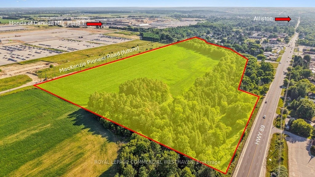 Royal LePage Commercial is excited to bring to market a rare opportunity to purchase approximately 28 acres of raw land directly adjacent to Honda Manufacturing Plant 1 in Alliston, Ontario. A unique site that includes EA2 zoning for industrial and commercial uses, fronting on both Highway 89 and future extension of MacKenzie Pioneer Road to the south. One of the few remaining EA2 zoned sites in the Industrial Parkway corridor with close proximity to other manufacturing businesses and established commercial and retail developments to the east like Walmart Supercentre. Approximately 16.75 acres is zoned EA2 (Employment Area Two Zone) permitting uses like auto, data processing, industrial, office, R&D and others with max height of 37m. Approximately 11.25 acres zoned EP (Environmental Protection Zone) which includes a beautiful tributary connecting to the Boyne River. The asking price works out to $389,000 per acres.