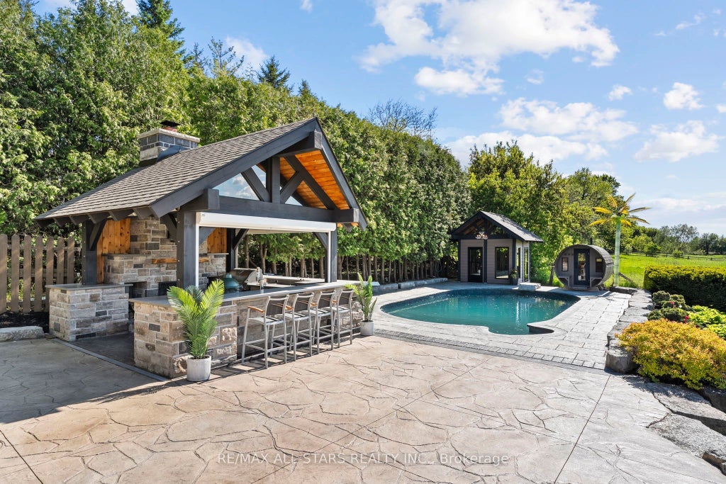 Why choose between home, cottage, or resort when you can have it all? This exceptional 4+1 bedroom executive home sits on a breathtaking 150' x 200' lot backing onto open fields with no neighbours behind, offering total privacy, sweeping sunset views, and a true entertainers dream. Inside, enjoy a light-filled open-concept layout with hardwood floors, crown moulding, a sunroom, and a stylish kitchen with granite countertops, heated floors, stainless steel appliances, centre island with bar fridge, and walkout to your backyard escape. The private primary suite feels like a luxury hotel with its gas fireplace, Juliette balcony, walk-in closet, soaker tub and spa-style ensuite featuring heated floors and glass shower. The finished basement includes a spacious rec room, bedroom, bath, and separate entrance ideal for in-laws or extended family. Outside is where this property truly shines: a resort-style backyard complete with a heated saltwater pool, hot tub, wood and electric sauna, outdoor shower, fire pit, and an absolutely show-stopping outdoor kitchen featuring a stone fireplace, built-in BBQ, keg fridge, bar fridge, smoker, ice maker, sink, ceiling fan, and automatic shutters. Whether you're hosting an intimate dinner or a lively summer party, this space delivers. Lush, low-maintenance landscaping is kept pristine with a Wi-Fi/timer-controlled inground sprinkler system and outdoor lighting for stunning evening ambiance. With a double garage offering front and back doors and basement access, a large shed, lean-to with hydro, and huge driveway, every detail is taken care of. All of this just minutes to Newmarket, Keswick, and Hwy 404, enjoy easy commuting with the feel of country living. This is more than a home; its a lifestyle.