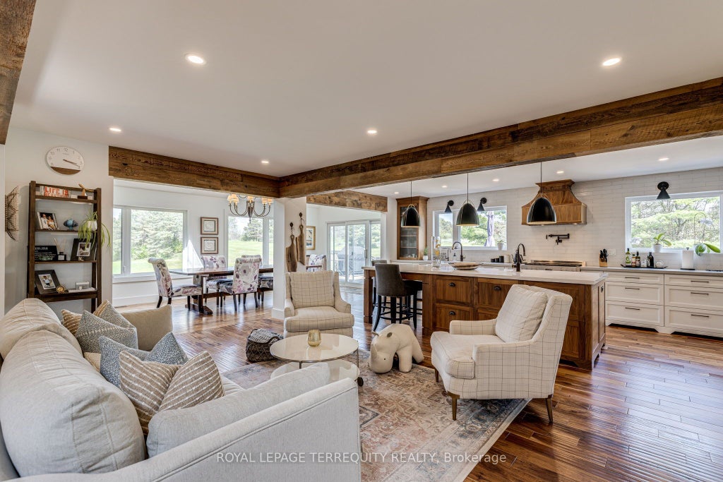 Your Country Escape Awaits. Breathe deeply... this is where peace meets luxury. Nestled on nearly 12 acres of rollinghills8 of them thoughtfully groomed this private country retreat blends elegance w/practicality in the most beautiful way. With over 5,400 square feet of beautifully finished living space, there's room here to live expansively & entertain effortlessly. Step inside and fall in love w/ the gourmet kitchen of your dreams. Custom walnut cabinetry,6-burner gas cooktop, built-in oven, steam oven, bronze fixtures, oversized island with prep sink & bar fridge create the perfect setting for everything from weekday meals to holiday feasts. Kitchen flows seamlessly into family room & grand dining area designed for embassy-sized gatherings all grounded by rich, hand-scraped walnut Floors, anchored by rustic wood beams. From here, walk out to sprawling deck made for entertaining & relaxing in total privacy, complete with space for lounging, dining, & soaking in the panoramic views of your own heated pool & peaceful countryside. Downstairs, beautifully finished living space with bedroom, 4 pc bath, laundry, dining room, radiant heated floors throughout, eat-in kitchen, sunlit living area, walk-out to private patio perfect for extended family. Aside from the suite you'll find ample space for yoga, playroom or whatever you can dream up, or as it's current use as oversized bedroom & exercise area and yet another 3 piece bath. Storage has been thoughtfully accounted for. Additional features:* Primary on main* 5 bathrooms* 50-year steel roof* Coveted natural gas service* High speed fiber optics* Satellite TV service available (Shaw, Bell, Rogers)* 2 Laundry facilities* Completely finished save for cold cellar and utility room* Total privacy with convenience just a short drive away This is more than a home. Its a lifestyle refined, relaxed, and ready to welcome you. Come experience the space, serenity, and craftsmanship of 1041 Concession Road.