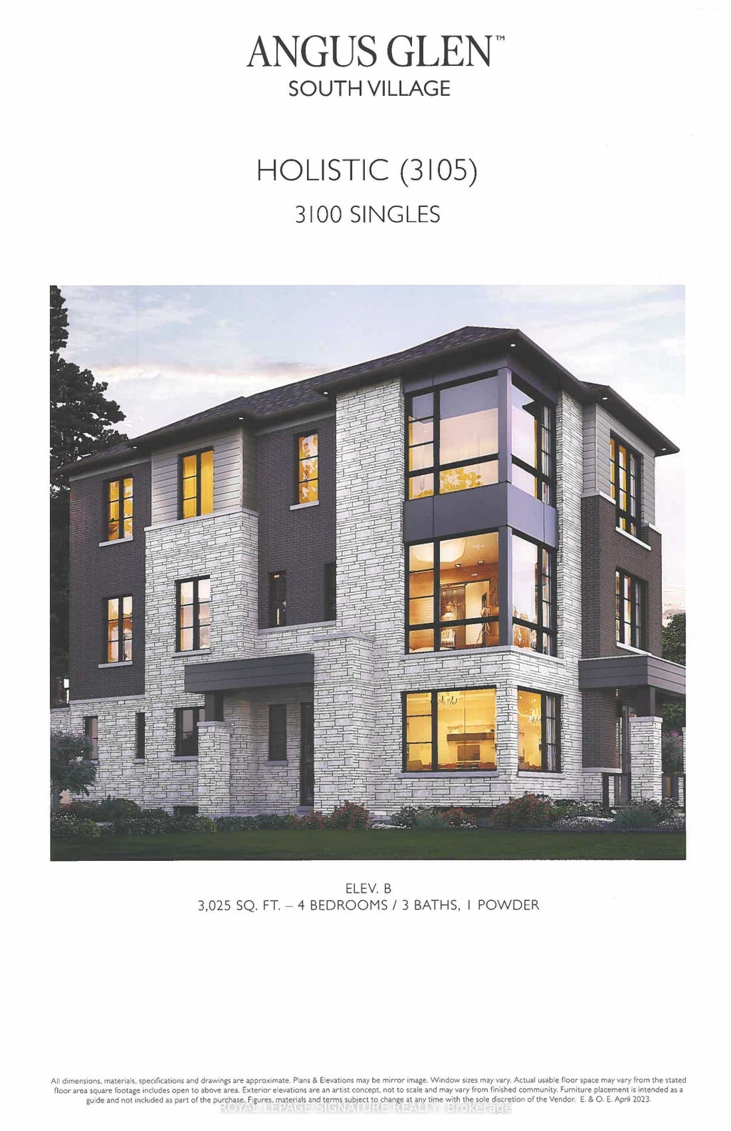 AMAZING OPPORTUNITY! Move in to this Stunning 3025 sq. ft. Modern Detached 4 Bed. 3.5 Bathroom BRAND NEW Home in Angus Glen South Village. Gorgeous neighborhood surrounded by protected green space, loads of trees and walking trail access. Superb high quality loft style windows, 9' 10' 9' Smooth ceilings, 8' doors, hardwood floors, and stairs, throughout, porcelain tiles in kitchen & bathrooms. Open concept kitchen /breakfast family rooms. Gas fireplace. Kitchen boasts built in 36" 'WOLF' S/steel gas stove, 34" hood fan, 36" S/S 'Sub Zero' fridge, 'Bosch' dishwasher, 'Wolf' microwave. Quartz counters, Upper cupboards to ceiling with trim & light valance, 'Yoga' Studio/could be office with wet bar & 3 piece bathroom French door walk out to balcony. Primary bedroom has Volume ceiling & 5 piece ensuite with stand alone tub, glass shower. Cold cellar in basement. 20 pot lights + 4 outside. 2 car garage + 2 car driveway. Close to Angus Glen Golf Course, Community Centre, great grocery store & 'Toogood Pond park. High ranking Pierre Elliot High School, New Elementary School coming 2027 within walking distance. Cat 6 R/I network wiring, elec. for TV.