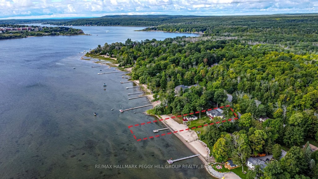 LUXURIOUS GEORGIAN BAY ESTATE WITH 83 FT OF SANDY SHORELINE, SECOND COTTAGE, DETACHED GARAGE & ALMOST HALF AN ACRE! 83 feet of Georgian Bay frontage with eastern exposure presents a private sandy beach with gradual entry, clear waters, and sunrise views that define the waterfront lifestyle. Set on nearly half an acre with a large back deck, the property is further enhanced by an expansive L-shaped dock with a bump-out that extends into the bay, offering an impressive setting for entertaining, lounging, and docking motorcraft. Located on a coveted cul-de-sac along sought-after Peek-A-Boo Trail and just steps from Tee Pee Point Park, the property delivers exclusivity and tranquillity while remaining approximately 10 minutes to local essentials and a short drive to Penetanguishene and Midland for expanded amenities. The primary residence introduces itself with a stately front entry, covered porch, manicured landscaping, and a detached two-car garage with six-car driveway parking. The kitchen is appointed with rich wood cabinetry topped with crown, granite counters, stainless steel appliances, and a built-in desk area. The living room features a bay window, crown moulding, fireplace, and French doors, while the spectacular sunroom boasts soaring ceilings, shiplap accents, pot lights, a dramatic fireplace, and a walkout. The primary bedroom highlights its own walkout to the sunroom, a walk-in closet, and a spa-like 6-piece ensuite. Extending the living space, the finished walkout basement showcases a massive rec room with a third fireplace, pot lights, and room for a pool table, along with a fourth bedroom and full bath, with the entire level opening directly to the yard and waterfront. A versatile second cottage with two bedrooms, a bathroom, a kitchen and a living area, and a private deck enhances the property's functionality for family and guests, while main floor laundry, in-floor radiant heating, central vac, and ERV/HRV systems add to the overall comfort.