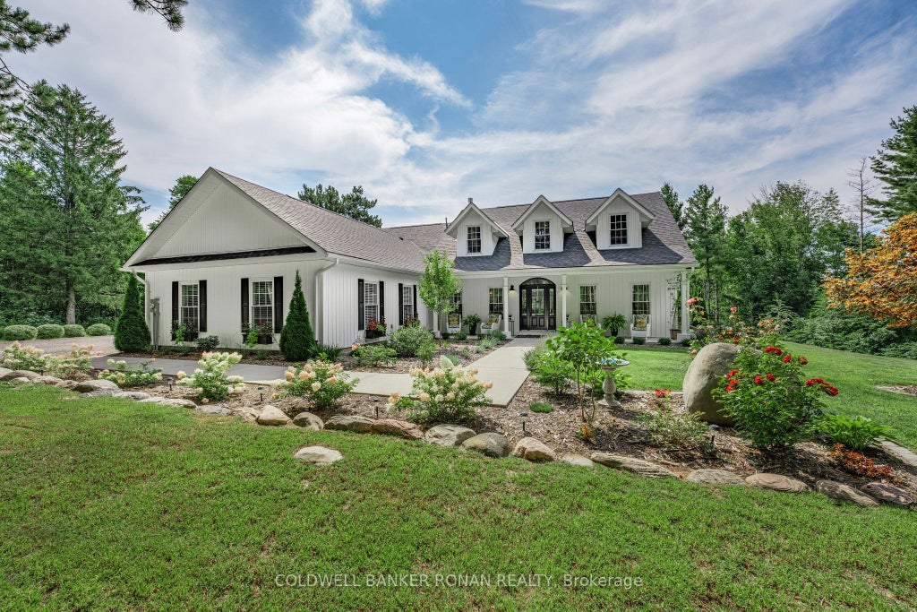 Thoughtfully designed and custom-built in 2018, this 3,006 sq. ft. modern farmhouse rests on 2.7 acres of landscaped grounds in one of Tiny Townships most desirable enclaves. Every element was carefully considered, from the timeless board-and-batten exterior with bold black accents to the warm, functional interior. The 3-car garage includes one bay converted into a workshop with stainless steel cabinetry, a hot/cold water sink, and direct access to a custom mudroom featuring floor-to-ceiling storage and artisan millwork. A walk-through pantry with barn doors, porcelain tile, and built-in cabinetry flows seamlessly into the kitchen. Inside, refined finishes include engineered bamboo floors, shiplap ceilings, grass cloth wallpaper, and custom millwork throughout. The open-concept kitchen and living area is designed for entertaining, highlighted by a quartz island, Bosch dishwasher, dual-fuel range with pot filler, microwave drawer, full-size fridge/freezer, and a Napoleon fireplace framed by built-ins with gallery lighting. Garden doors extend the living space to a 58-foot covered porch with ceiling fans, perfect for enjoying the private yard views. The primary suite creates a tranquil retreat with an antique electric fireplace, spa-inspired ensuite, walk-in closet, and direct laundry access. Two additional bedrooms (each with an ensuite or nearby bath), a den with wet bar, and an upstairs bonus room (optional 4th bedroom or family room) offer versatile space for family and guests. Outdoors, enjoy the stone firepit with Adirondack chairs and umbrellas (included), mature gardens, and manicured lawns. Additional features include propane heat, central air, central vac, pot lights, slab-on-grade foundation, and custom blinds. Ideally located just minutes from Georgian Bay and Midland.