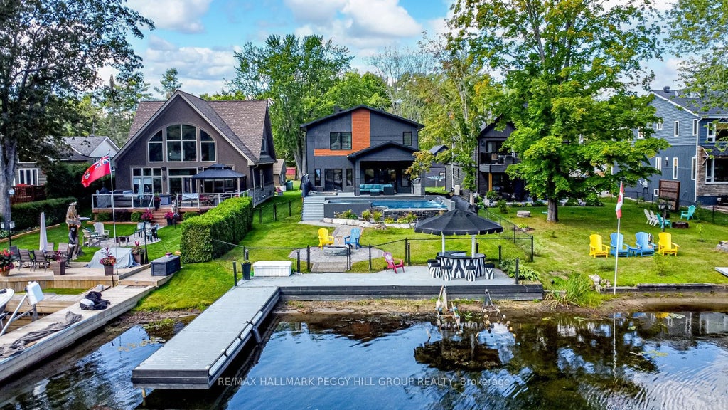 STRIKING ARCHITECTURE, WATERFRONT SERENITY, & ENDLESS LUXURY - A CONTEMPORARY MUSKOKA HAVEN WITH OVER 2,800 SQ FT OF STYLE! Welcome to a waterfront retreat with 50 feet of direct shoreline on the Trent Severn Waterway, where every day feels like a Muskoka getaway. Surrounded by lush forests, lakes, hiking trails, and golf courses, this location offers year-round adventure, with the Lauderdale Point Marina and Resort just steps away for waterside dining and boating convenience. Only 15 minutes to Washago and 25 minutes to Gravenhurst, the property balances peaceful seclusion with easy access to daily essentials. Striking curb appeal is showcased by bold modern architecture with rare imported stone, while the driveway and attached double garage provide parking for 10+ vehicles and toys. The private, fully fenced backyard has been transformed into a luxury resort with a heated pool, bubbling hot tub, outdoor TV, firepit lounge, and an outdoor kitchen, all overlooking a private dock with a jet ski ramp and the charming Zebra Bar, a beloved landmark amongst the welcoming neighbours. Inside, 2,800+ sq ft of stunning living space offers open-concept flow, with a living area centred around a fireplace and a walkout to the deck, and a designer kitchen with an oversized island, professional gas stove, and custom lighting. The main level also features a versatile bedroom or office, a powder room, and a mudroom with garage entry. Upstairs, three bedrooms and a laundry room are enhanced by a flexible rec space, while the primary suite delivers a spa-like escape with panoramic lake views, a walk-in closet, and a 5-piece ensuite with a deep soaker tub and walk-in glass shower. Thoughtful upgrades, including dual 200-amp services, a Generac transfer switch, on-demand hot water, and a UV water treatment system ensure peace of mind for years to come. This is more than a #HomeToStay - its a Muskoka waterfront lifestyle of luxury, leisure, and unforgettable memories!