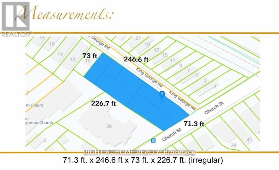 17,244 sq. ft. assembly of residential land for sale for potential to build 34-40 towhouses (buyer to do their DD); located on 40 & 42 Church St. and 4 & 6 & 8 King George Rd. TORONTO, Approx. 0.4 acres; Frontage 246.6 ft. on King George Rd., Corner property, 2 STREET FRONTAGES; Potential for REDEVELOPMENT to Detached houses, Townhouses, or Stacked Townhouses; PRIME LOCATION NEAR PEARSON INTERNATIONAL AIRPORT; DIRECT ACCESS TO HWY 401, PROXIMITY TO HWY 400 & HWY 427; Proximity to WESTON GO (4 min. Drive); Steps to Humber River; Schools and Universities; Demetrius Catholic School - 8.7 of 10