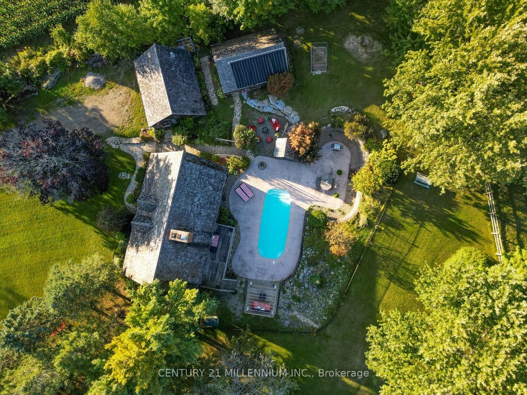 Welcome to this enchanting log home that perfectly blends rustic charm with modern comforts. Nestled on a serene one-acre lot in the rolling Caledon Hills, this beautiful property offers a peaceful country lifestyle just minutes from town. Inside you are greeted by original beamed ceilings, wide plank floors and a striking stone fireplace that serves as the heart of the home. The open living and dining areas flow together creating a warm and inviting atmosphere ideal for both everyday living and entertaining. Waking up in the spacious 2nd floor primary bedroom brings joy to each mornings as the sun peeks over the horizon in this east-facing retreat that features a private lounging area & direct walk-out access to the backyard pool, garden & trees. The third-level loft & 4th bedroom are also hidden gems, ideal as a quiet getaway spot or perfect for guest rooms. Outdoors, you'll find winding flagstone pathways, lush perennial & pollinator gardens plus a cozy fire pit for unforgettable evenings under the stars. Hobbyists and DIYers will appreciate the large detached workshop/shed offering endless possibilities for creative projects or extra storage. Originally crafted from Ottawa Valley square logs and reassembled in Caledon in 1983, this home has aged beautifully with a silver patina that blends seamlessly into its natural surroundings. And when you're ready for an adventure, quaint villages, scenic hiking trails, ski slopes, art galleries and cozy cafes are all just a short drive away. This isn't just a house - it's a place to slow down, breathe and truly feel at home. Pool has been prof maintained, opened & closed. Pool pump new in 2021. Solar controller system (pool) new in 2023. WETT inspection of Wood Fireplace passed Jan 2025. Primary heating is by propane stove with electric baseboard as backup.