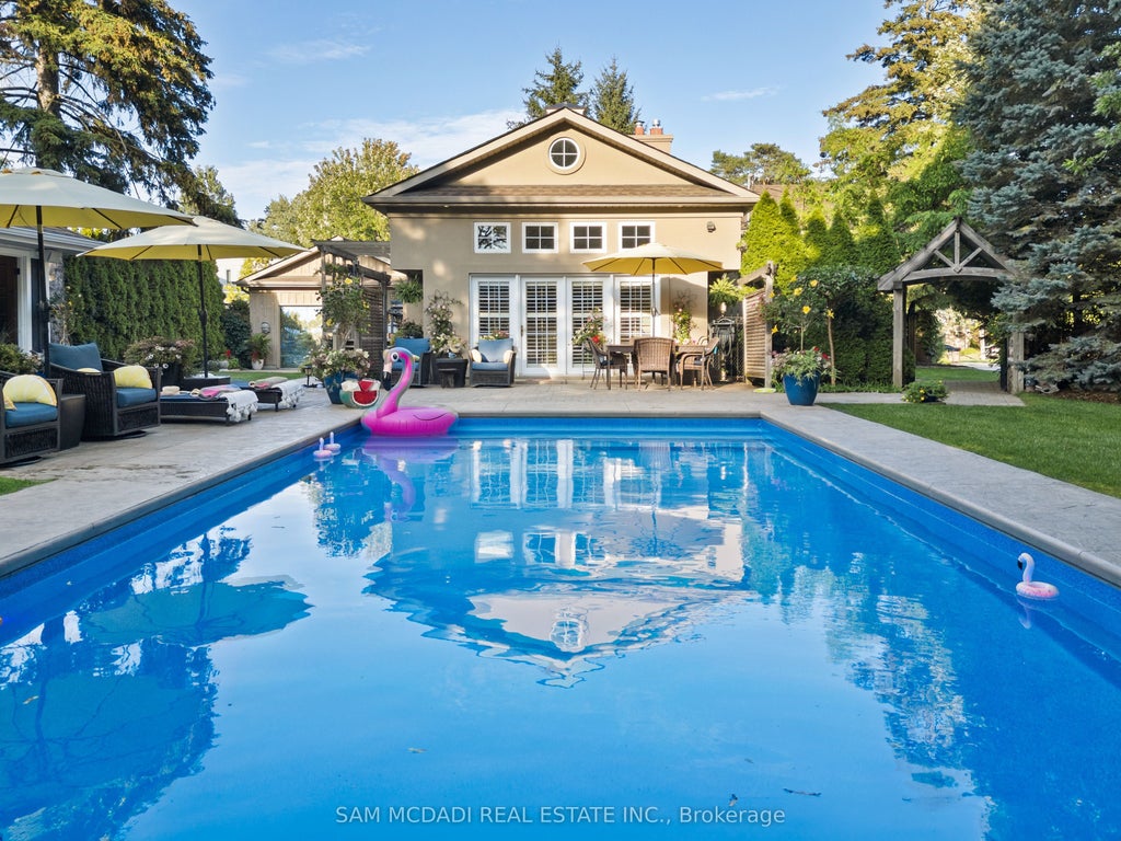 Welcome to 1522 Glenhill Crescent in the prestigious Lorne Park, where timeless charm meets resort-style living on a generous 80 x 155 ft lot. This meticulously maintained bungalow offers over 2400 sqft of bright and inviting living space, complemented by an extraordinary backyard. Step outside to your private retreat, featuring a sparkling oversized heated saltwater pool, lush gardens, and mature evergreens that provide both beauty and privacy. Outdoor amenities are endless - relax poolside on the expansive stone patio, unwind in the roof-covered hot tub, enjoy the Muskoka-inspired cabana with a finished change room, or dine under the pergola on the raised deck. A tranquil waterfall and vibrant landscaping complete this one-of-a-kind entertaining and relaxation oasis. Inside, expansive windows fill the home with natural light. The spacious kitchen showcases stainless steel appliances, granite countertops, a breakfast bar, a travertine backsplash, walkout to the deck and ample storage. The great room impresses with soaring 12-foot ceilings, a gas fireplace, floor-to-ceiling windows, and a walkout to the patio. The primary suite features a walk-in closet and a 4-piece ensuite with a separate shower and whirlpool tub. The finished lower level extends the living space with two bedrooms, a 4-piece bath, a family room, a wine cellar, an office, and a dedicated laundry area. An oversized heated two-car garage with epoxy floors, cabinetry, a workstation, and loft storage enhances the homes functionality. Just minutes from Lake Ontario's scenic trails, Jack Darling Park, top-rated schools, and the vibrant communities of Port Credit and Clarkson Village, with easy access to highways and GO Transit - this move-in-ready home offers not only a private resort-like lifestyle but also outstanding potential to expand or renovate in one of Mississauga's most coveted neighborhoods.