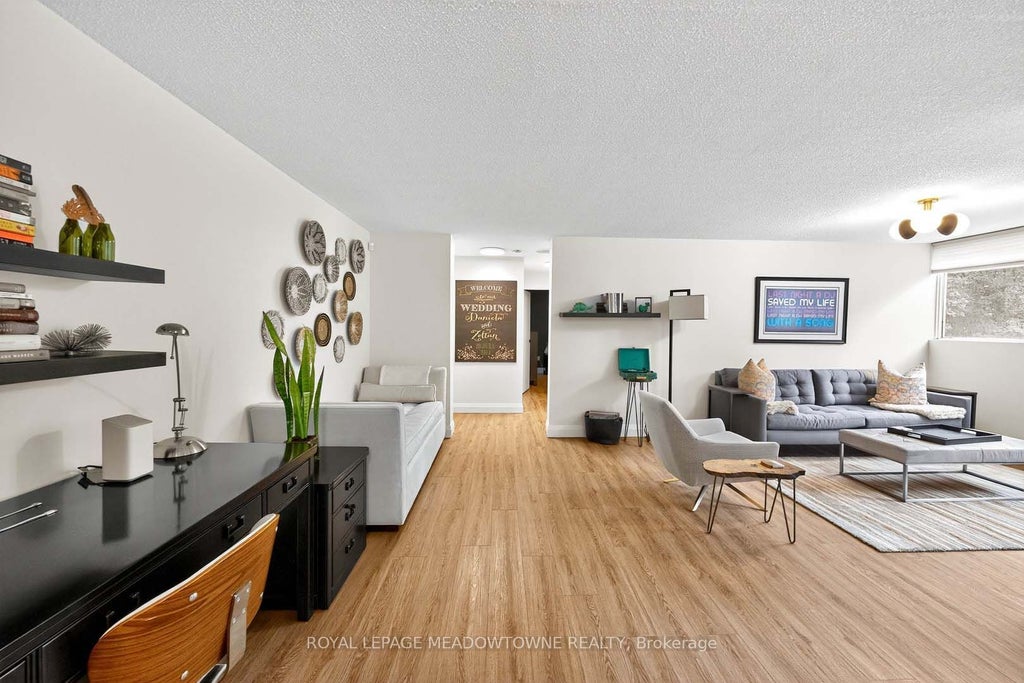 Beautifully updated, full of natural sunlight. This large unit offers over 1,200 sq. ft. of great living space, with bedrooms and living areas nicely separated for comfort and privacy. It feels tucked away and peaceful, with greenery right outside your window. Best part: you can skip the elevator and just walk right in. With only 2 other units on this side of the floor, its quiet and private. Inside, everything has been updated and well cared for. Youll love the vinyl plank flooring throughout, custom blinds, custom California closets, the convenience of in-suite laundry, and the large storage/pantry. Bonus are the 2 side-by-side parking spots, a rare find! On top of that, this building offers some of the lowest condo fees in the area. The sellers are even open to renting it back for a couple of years, which works perfectly for buyers who want flexibility or investors looking for a solid option. If you prefer, the den can easily be converted back to the original floor plan. In addition, you have a large storage locker, indoor swimming pool, tennis court, basketball court, pool tables, gym, sauna, and a BBQ area to enjoy the great outdoors with your family. All of this in a prime location in the heart of Mississauga: close to schools, Sheridan College, hospital, public transportation, parks, Square One Shopping Centre, Central Library, and major highways with the LRT soon coming to Hurontario. Move-in ready, just unpack and enjoy!
