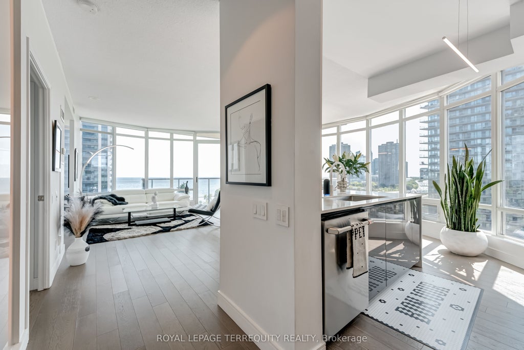 For those who envision life framed by skyline silhouettes and shimmering lake views - this is it! This rarely offered 2+1 bed, 2 bath residence features a functional split-bedroom layout and over $70K in luxury upgrades and finishes. Designed with contemporary flair, every detail has been thoughtfully curated for the discerning buyer who values comfort, design, and elegance. The finest materials, craftsmanship, and finishes elevate this suite to Architectural Digest-worthy status. Enjoy breathtaking 180-degree panoramic views of the city skyline, shoreline, and sunsets through dramatic 9-ft floor-to-ceiling windows. A wall of glass fills the open-concept living and dining area with natural light, creating a warm and expansive atmosphere. Step onto the balcony to unwind and take in golden hour over the lake. A sleek, contemporary kitchen appointed with a quartz waterfall island, countertops, backsplash, and top-of-the-line appliances. The versatile den overlooks the main living space and can function as an office or nursery. The primary bedroom offers a 4-piece ensuite and double closets, while the second bedroom features floor-to-ceiling windows and ample storage. Premium interior upgrades include designer lighting, custom frosted glass panels with backlighting in both bathrooms, custom designed kitchen, upgraded quartz countertops with waterfall edges, and superior hardwood flooring throughout. Nestled in a lush waterfront enclave, this residence offers the perfect blend of serenity and city life. Just minutes from High Park, Sunnyside Beach, Grenadier Pond, and the Lake Ontario boardwalk, nature and leisure await. You're also under 8 minutes to the charm of Bloor West Village with cozy cafes, fine dining, artisan markets, and boutique shopping. With top-rated schools, hospitals, seamless transit, and only 20 minutes to downtown, every urban convenience is easily within reach.
