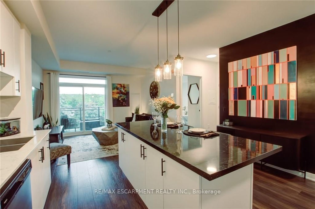 Check out this amazing unit in the Trendy Affinity Condos! Living room, bedroom and terrace offer amazing sunset views of the Escarpment! Upgrades in this lovely high ceiling 1bdrm w den/workspace and 3pc bathroom. In suite laundry, master bedroom closet organizer. Large designer look kitchen area, loads of counter & cupboard space with adjacent bright living room perfect for entertaining. Newly replaced expanded quartz black island counter top with seating for 4-6 great for cooking and entertaining. Brand new stylish cabinet and door black hardware. Matching new quartz black counter in 3pc bathroom with stand up upgraded shower and tiled bathroom. Brand new fashionable black light fixtures throughout. TWO OWNED side-by-side underground parking spaces!! Loads of building amenities roof top patio with lounge area with fireplaces and barbeques. Work out gym with quality equipment, workout and yoga room. Party/games room, conference room, lots of visitor parking with an electric car charger station available. Unit locker is owned and located on the same level, convenient for storage. Providing modern living in the vibrant Aldershot neighbourhood! Located near GO Station, major highways, the downtown core, shopping and more! Lock and-leave lifestyle perfect for busy professionals or empty-nesters. (Investors welcome too...A+++ tenant offering to stay on for additional years).