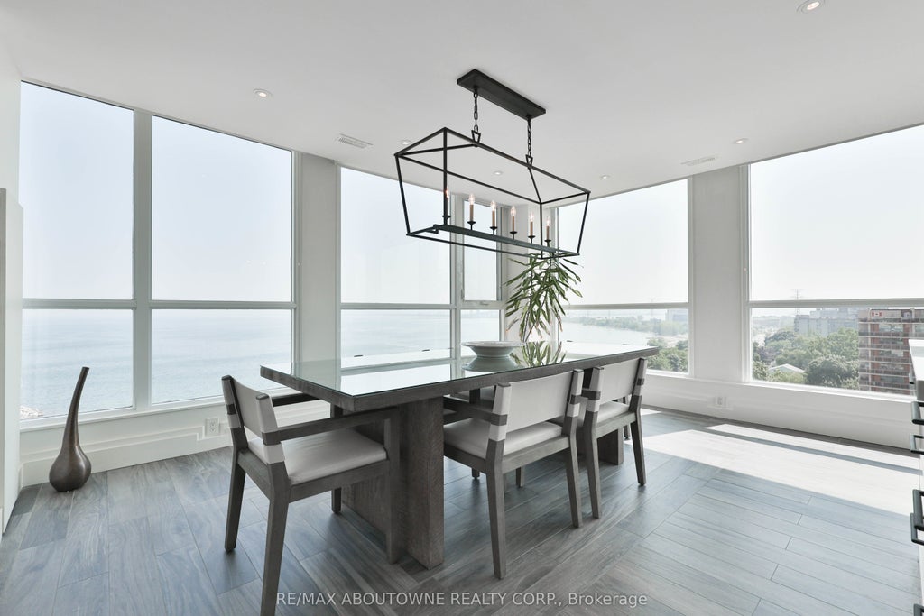Style and sophistication abound in the heart of downtown Burlington in this stunning southwest facing corner unit offering panoramic views of Lake Ontario, Burlington Pier and Niagara Falls on a clear day. Located in prestigious Harbourview Residences, this outstanding, completely renovated 1,829 sq ft, 2 bed plus den and 2.5 bath residence is bathed in natural light, boasting wall to wall and floor-to-ceiling windows with motorized blinds. A thoughtfully designed open-concept layout connects the substantial living room with a TV feature wall, a gorgeous large dining space with built-in china cabinet, and a large gourmet chefs kitchen complete with breakfast area. The brand-new custom kitchen is a showpiece featuring new cabinetry, quartz countertops and backsplash, high-end stainless-steel appliances incl. induction cooktop and SS range hood, oversized refrigerator/freezer, hot water tap, substantial cupboard and counter space and a large island perfect for entertaining. The spacious primary suite is a sanctuary with a coffered ceiling, custom closets, floor-to-ceiling windows and a newly updated spa-like ensuite featuring an oversized frameless glass shower, custom vanity with quartz counter and ample storage. The second bedroom with its own breathtaking views comes complete with a 3 piece ensuite and custom closet. A versatile home office space, a powder room and a full-size laundry room allows for convenience and additional storage. The unit comes with 2 underground parking spots and 2 lockers. Residents enjoy amenities incl; car wash, exercise room/gym, sauna and 2 rooftop terraces with BBQs. Just steps away, enjoy all that downtown Burlington and waterfront living has to offer while minutes to major highways and conveniently located between Toronto and the Niagara region's many features. This is urban luxury redefineddont miss this exceptional opportunity.