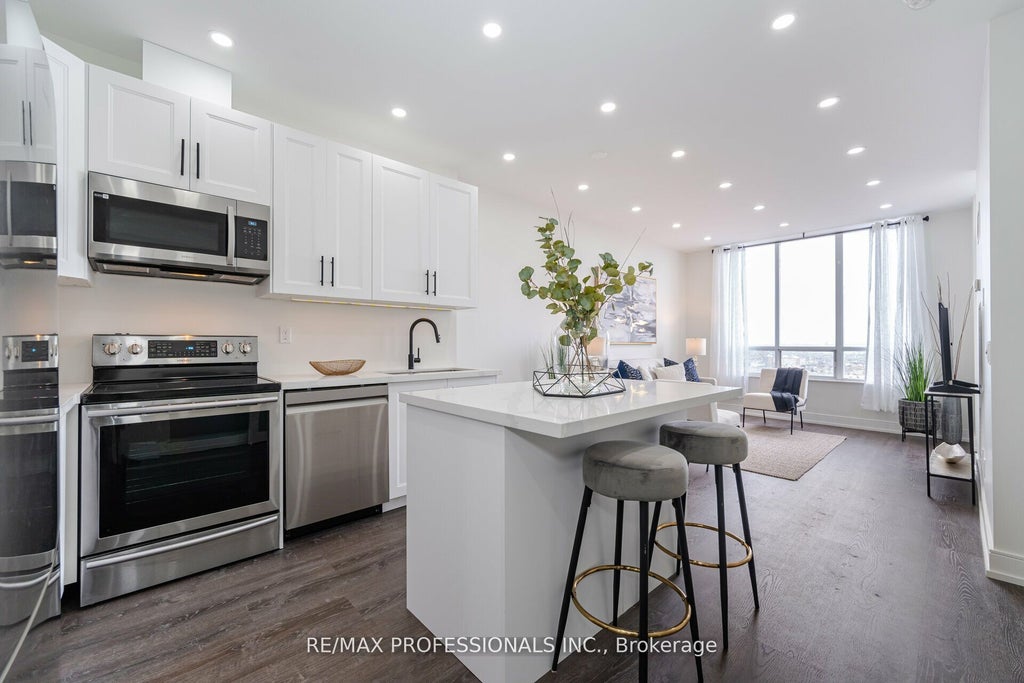 Step into sophisticated penthouse living at the prestigious Humber Mansions by Tridel. Fully renovated in 2024, this breathtaking residence showcases exclusive 9 smooth ceilings, a designer kitchen with quartz countertops and island, a spa-inspired bathroom, and custom finishes throughout, including all-new flooring, doors, and modern pot lighting. Flooded with natural light, the open-concept layout offers panoramic views and seamless indoor-outdoor living with a private balcony. The spacious primary suite features a large walk-in closet, while ensuite laundry adds everyday convenience. Residents enjoy world-class amenities: a 24-hour concierge, indoor pool with hot tub and sauna, tennis courts, state-of-the-art fitness centre, billiards and party rooms, plus guest suites for visitors. Ideally located just minutes from Woodbine Racetrack & Casino, Pearson Airport, Humber College, premier shopping, hospital, TTC, and major highways this penthouse is where luxury meets lifestyle.