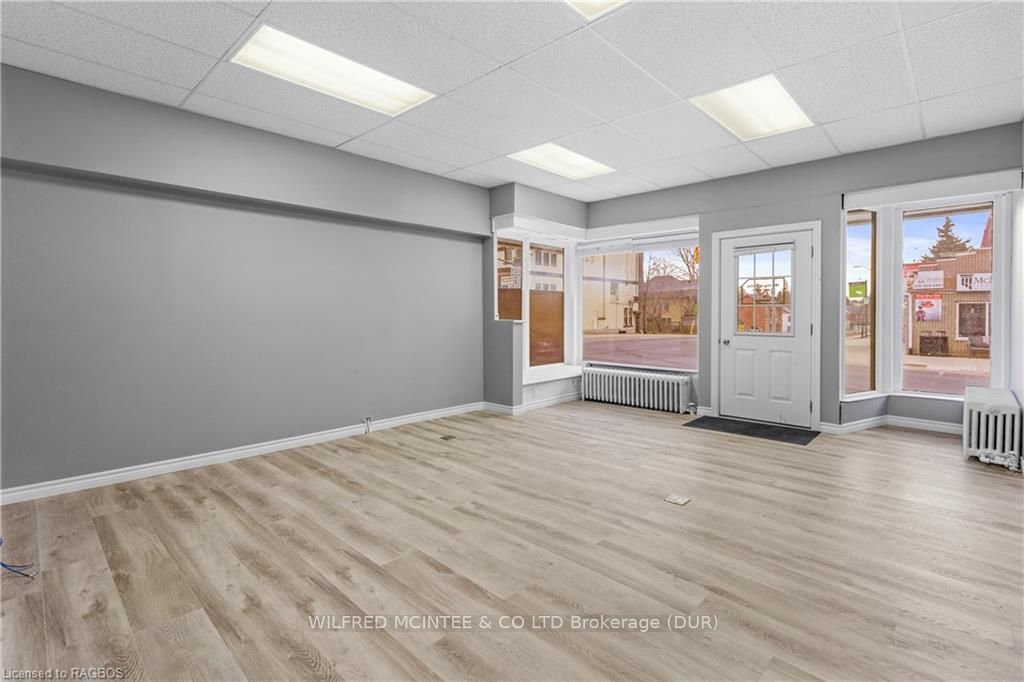 Excellent commercial space in Harriston located on the corner of the main intersection. This bright and clean space has great bay windows and consists of approximately 550 square feet with a large main room, 2 additional rooms, and 1 bathroom. Superb layout for retail and offices. Ample space for signage and branding. A gravel parking lot for employees is situated at the back of the building. Curb side parking lines the front entrance and south side street.