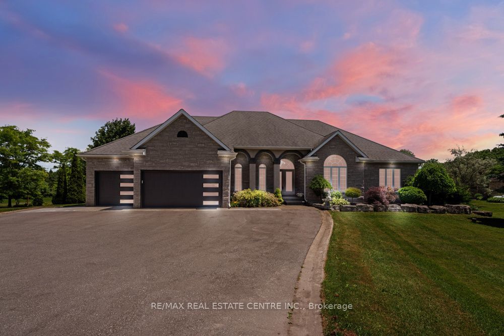 Exquisite Custom Built Bungalow on a 2.5 Acre Lot with Detached Garage-Workshop! This serene property has exceptional features. Spectacular curb appeal with stone plus stucco exterior, premium landscaping, paved driveway and custom concrete. Enter with your vehicle through the triple car garage or covered double man door entry. High vaulted ceilings in the dining and living room with large windows. Nice kitchen with an island open to the family room with a fireplace and French doors to a beautiful deck. 4 good size bedrooms with a 5 pc main bathroom. The Primary - Master bedroom offers a walk-in closet and 5 pc Ensuite bathroom. California shutters throughout the main floor. Main floor Laundry room with garage access. Huge unfinished walk-out basement with rough-in for another bathroom and kitchen. This premier lot offers scenic estate views. 25 ft x 50 ft Detached Garage Workshop provides additional space. Well located property nestled between multiple executive country estates with easy access to Cambridge, HWY 401 and many desirable amenities. Don't miss out on this one of a kind property. Book your private viewing today!
