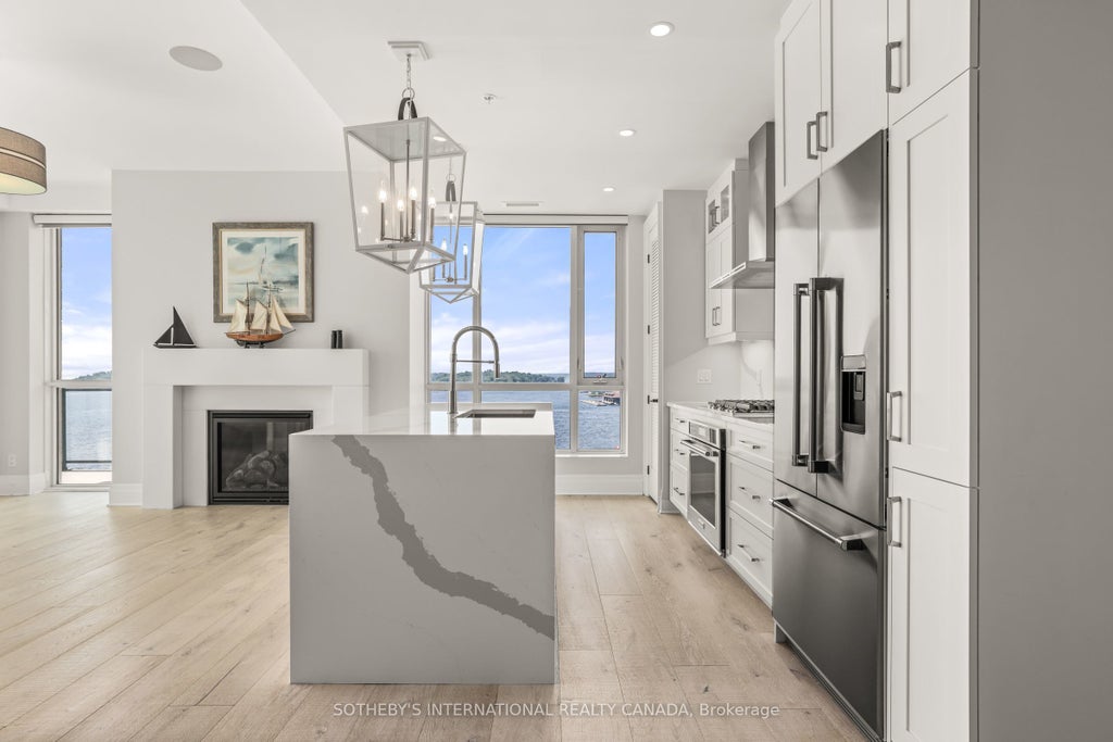 Luxury Penthouse Condo with Endless Boating Adventures in the Heart of the Thousand Islands. Step into this exquisitely appointed 2-bedroom, 2-bath penthouse and be transported to a world of tranquility, with breathtaking 270-degree panoramic views of the iconic Thousand Islands and St. Lawrence River. Soaring ceilings and large windows walls flood the space with natural light, framing unobstructed, postcard-perfect vistas stretching from the marina to the open river and beyond. This exclusive residence is a dream come true for boaters. Your private boat slip offers direct access to unparalleled adventures. Cruise eastward to the Atlantic Ocean or navigate north through the historic lock system from Kingston to Ottawa. With endless boating possibilities at your doorstep, this home is the perfect launch point for every journey. Step outside onto your very private wraparound patio to watch the boats drift by or prepare dinner for family and friends with the built-in gas BBQ connection. Inside, refined finishes abound: a cozy gas fireplace, built-in speakers, electric blinds, and an open-concept living space that flows into a chefs kitchen featuring high-end appliances, designer cabinets and a striking waterfall island. Ample storage includes two lockers, one of the largest on the floor plus a dedicated parking space. This is more than a residence, its your front-row seat to waterfront luxury and boundless nautical freedom in the heart of the Thousand Islands.