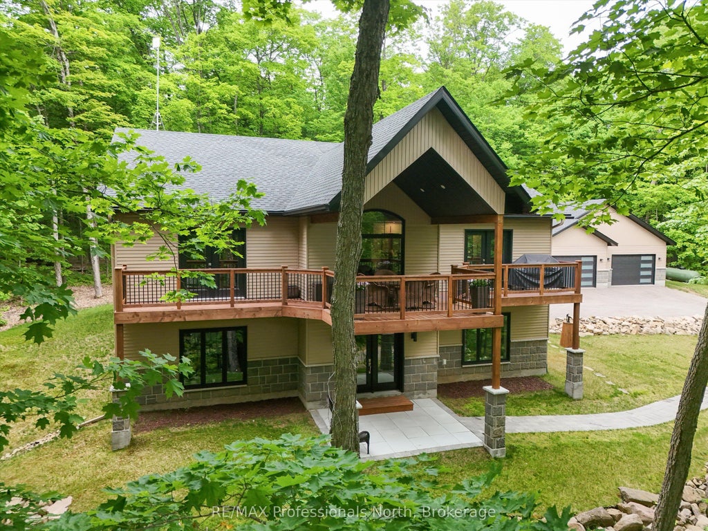 This stunning 4 YEAR new home designed for comfort and luxury, offering Muskoka living at its best with breathtaking views and access to Walker Lake, almost 6 acres of hardwood with exceptional privacy.This thoughtfully crafted 4-bedroom, 3-bathroom residence boasts elegant architecture and premium finishes, making it the perfect retreat for family living and entertaining for large groups with all the comfort for enjoyable gatherings. Just 12 minutes from Huntsville, with nearby Hidden Valley ski hill, Club Link golf courses, Limberlost Reserve, Algonquin Park, and shopping in the historic town of Huntsville. This 4-year-old build features a spacious open-concept living area, seamlessly connecting the living room, dining space, and kitchen. The kitchen is equipped with premium Bosch and KitchenAid appliances, an expansive island with bar fridge. Enjoy the warmth and character of beautiful Maple hardwood floors, harvested in Quebec, that flow throughout the upper level. Tucked away on a quiet dead-end road with no neighbours on either side, this property offers unbeatable privacy on 5.8 acres on trails. Step outside to the patio stone terrace, where a cozy gazebo, fireplace, create the perfect spot for gatherings or quiet evenings under the stars. Take a dip in the luxurious fiberglass pool/spa, designed to seat12, plenty of deck space for lounging.This home offers a dedicated wellness room on the lower level, with a dry-type sauna for two, exercise equipment included, and complete with LED-wall mounted TV. In addition there is an office/den facing the lake, filled with natural light and afternoon sun, providing an inspiring workspace with breathtaking views. Detached large 1000 sq ft, 3-bay insulated garage, with bonus attached carport. Experience the charm, comfort, and privacy of 1333 Walker Lake Drive. Schedule your private showing today and see why this property is so special!!