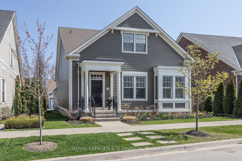 Welcome to the Village, a very charming community of period style houses. This home was built in 2017 with numerous upgrades by the current owners, and offers all the modern conveniences as well as terrific character. The welcoming foyer with a dramatic open spiral staircase leads into a quiet den, and an open concept kitchen/dining/living room with dramatic vaulted ceilings, flooded with natural light. The elegant finishes include hardwood floors, gas fireplace, crown moulding, French doors, and custom designed built-ins and cabinetry. Towards the rear of the home, French doors lead down into the back entrance with laundry, as well as walkouts to the one car garage with additional parking space, and the beautifully landscaped back/side gardens and patio. The primary bedroom is located on the main floor and has a spacious walk-in closet as well as a five piece spa-inspired ensuite washroom. Upstairs, there are two additional bedrooms and an open family room that overlooks the living and dining room. The finished lower level is extremely spacious and bright with a kitchenette and dining area, a recreation room and home office, plus ample storage and a second laundry. This lovely property is located just minutes away from the town of Niagara-on-the-Lake, with shops, restaurants, parks, and Lake Ontario. The house is walkable to the nearby plaza with Shoppers Drug Mart, LifeLabs, medical center, a future Foodland grocery store, banks, and more. Surrounded by wineries, orchards, and golf courses, experience all that the Niagara Region offers in this quiet and idyllic neighbourhood. *Open House Saturday, October 18th*