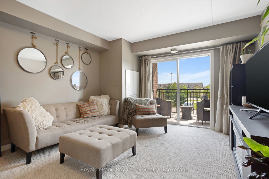 Welcome to Kingsbury Square and your new bright, beautifully maintained 2-bedroom, 1-bathroom condo. This spacious unit offers an excellent opportunity for first-time buyers, investors, or those looking for low maintenance living in Guelph's popular south end. With an open concept layout, the large entry showcases: a modern kitchen with granite countertops, a breakfast bar, and stainless-steel appliances; a big, functional dining space and airy family room for everyday use or entertaining; and a balcony featuring added privacy from neighbouring units given its corner location. Additional highlights include in-suite laundry, ample storage, and one owned parking space, conveniently located just steps away from the front-or-side-door entrances. With affordable condo fees and prime proximity to shopping essentials and a variety of restaurants, this charming condo is the perfect place to call home.