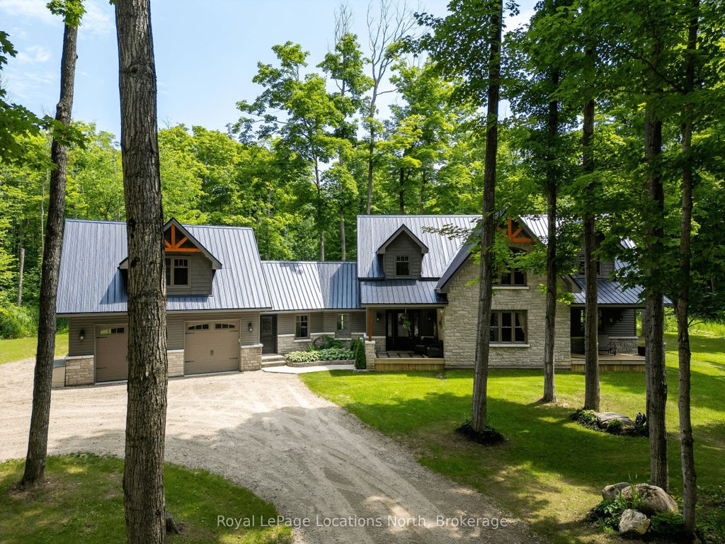 Private sanctuary on 25 acres of serene Meaford countryside, where mature trees and tranquility await. This custom-built retreat offers a blend of luxury and comfort, designed to embrace the beauty of its natural surroundings. A short drive to Downtown Meaford and Georgian Bay. Step inside to discover the heart of the home a great room with vaulted wood-covered ceilings, floor-to-ceiling windows framing views of majestic trees, and a striking stone surround fireplace. The open concept gourmet kitchen features granite counters, a 4ft range, built-in microwave, bar fridge in the island, and a convenient pot filler. Adjacent is the dining space with a walkout to the back deck, perfect for alfresco dining. The main floor also hosts a guest bed, den space, convenient laundry room and mudroom with access to the oversized garage. Throughout the main floor,3/4 inch special walnut plank flooring adds warmth and elegance. All bathrooms are beautifully appointed with granite counters and heated flooring beneath polished ceramic tiles. Upstairs, the upper level offers additional living space with a primary suite, guest bed, 3pc bath, and a versatile bonus room. The spacious primary suite features a covered balcony overlooking the lush grounds, WIC, and a luxurious 3pc ensuite complete with heated floors, heated towel rack and a freestanding tub. Additional features include a durable steel roof, a 10kw backup generator, and 1000sqft drive shed with 200 amp service offers plenty of storage for seasonal toys or use as a workshop! Above the garage, a loft area offers storage or potential studio. The lower level has potential for a huge rec space. Outside, the expansive and private exterior invites exploration and quiet contemplation, making this property an ideal weekend getaway or full-time residence. Just 8 mins from dtown Meaford's restaurants, shops, and Georgian Bay. Thornbury is a short 18-minute drive away.