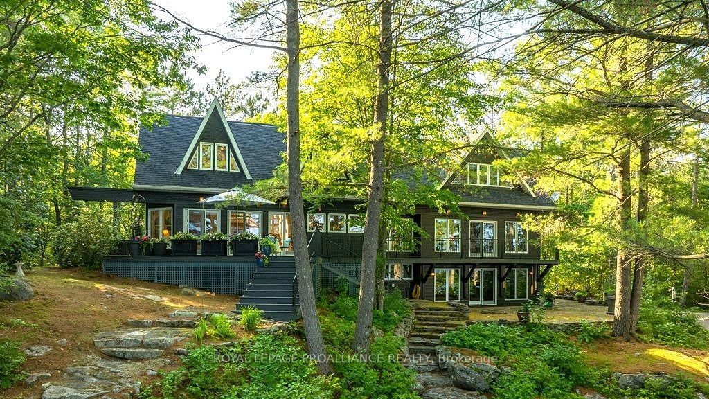 Immerse yourself in the tranquility and elegance of this architecturally inspired home, perfectly nestled into its natural surroundings on the pristine shores of Skootamatta Lake. Thoughtfully designed and recently renovated, this exceptional property offers over 3,300 sq. ft. of living space that blends comfort, craftsmanship, and a waterfront lifestyle that is welcoming and rewarding. The main residence captures stunning lake views from nearly every angle. A walkout dining area offers a panoramic vista to the water, while the wraparound deck and stone pathways lead you through the beautifully landscaped grounds to the shoreline. The modernised yet warm kitchen opens into a welcoming living area that flows seamlessly to the outdoor patio,ideal for entertaining or quiet reflection. Every detail of this home has been curated to support both relaxed living and gatherings. The main floor primary suite features lake views and a spa-like ensuite with soaker tub and steam shower. Additional highlights include a cozy library, home office, two fireplaces, sauna, and numerous walkouts that blend the indoors and outdoors. Upstairs, guests will find spacious accommodations with quiet seating areas and panoramic views. A detached garage includes a well appointed loft apartment above, offering a private space for visitors or extended stays, with a workshop and parking below for added convenience. At the waterfront, lounge in the seating area or head to the dock for a swim or paddle. Skootamatta Lake is known for its clean, deep water, unique topography, and access to expansive Crown Land, perfect for all types of recreation.The Land O Lakes region is a hidden gem easily accessible from the GTA and Ottawa and provides a waterfront lifestyle that rivals traditional cottage markets. This property exemplifies this position, offering indulgences, practicality and lifestyle that showcase the region and the available opportunities. Welcome to the Land O Lakes.