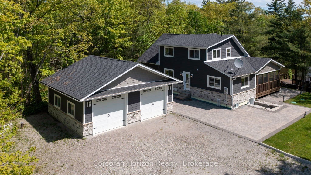 Welcome to 450 Crooked Bay Road! An exceptional four-season cottage retreat on the crystal-clear waters of Six Mile Lake in beautiful Muskoka. Set on over 220 feet of pristine waterfront, this 2019-built gem sits on flat, professionally landscaped grounds, perfectly suited for relaxed lakeside living and entertaining. Inside, you'll find a vaulted great room that seamlessly combines the open-concept kitchen, dining, and living areas ideal for gathering with family and friends. A charming Muskoka Room offers the perfect space to unwind while taking in serene views of the lake. The main floor hosts two well-appointed bedrooms and a stylish full bath, while the upper level offers a private primary suite, an additional full bath, and a spacious loft-den perfect for a home office, lounge, or guest area. The oversized double garage provides generous space for vehicles, recreational gear, and all your water toys. Located on a paved, township-maintained road just minutes from Highway 400, the property ensures easy, year-round access. Enjoy proximity to skiing, golf, and charming local amenities, all just 90 minutes from the GTA. This move-in-ready cottage offers the ideal blend of privacy, convenience, and classic Muskoka charm perfect for both peaceful getaways and stylish lakeside entertaining. Your Muskoka lifestyle begins here.