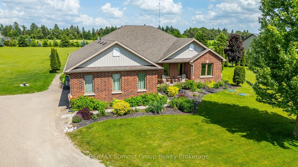 A perfect blend of style, comfort & space on 2.57 acres. Discover a refined fusion of modern upgrades and timeless charm in this meticulously maintained bungalow. Step into a semi-open-concept layout where maple hardwood floors guide you through a thoughtfully designed interior. The living room's cathedral ceiling is anchored by a striking double-sided stone fireplace, creating a cozy, inviting centrepiece for evenings at home. All windows and frames have been replaced, filling the home with natural light, framing picturesque views of the property, and ensuring energy efficiency throughout. The spacious 3-bedroom floor plan includes 2 full baths, with the primary suite featuring a private ensuite. A dedicated office at the end of the hallway offers a quiet spot for remote work or study. The kitchen, with its generous island, flows into the dining area, sharing the warmth of the double-sided fireplace, and opens to a covered rear deck ideal for outdoor entertaining or peaceful morning coffees. Additional features include a walk-in pantry, main-floor laundry with direct access to the attached garage, and a full basement with a family room, rough-in for an additional bath, and plenty of potential for added living space. A cold cellar caters to culinary enthusiasts or gardeners. Recent updates include a Carrier furnace and central air conditioning, plus enhanced attic insulation that extends above the garage for year-round comfort. The 2.57-acre lot, set within a serene estate subdivision just minutes from Grand Valley, offers mature trees, privacy, and a hard-wired Invisible Fence for pets. Perfectly located, close enough for commuting or day trips to Toronto, yet far enough to enjoy a quieter pace, this home offers a true retreat for families, professionals, and retirees alike.