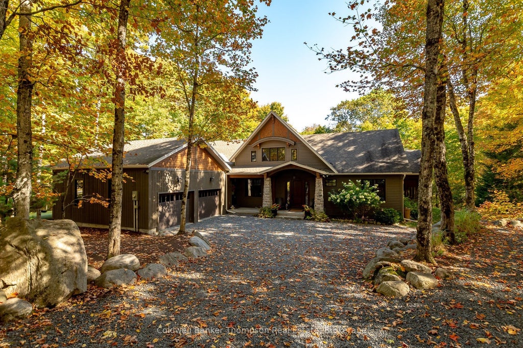 Welcome to the coveted Robinson Estates enclave. This stunning craftsman-style executive residence exudes elegance & comfort. Nestled amidst picturesque surroundings, this charming bungaloft boasts captivating curb appeal. Step inside the custom Spanish Cedar entry with an 8' door to the foyer with slate floors. The main floor features 2 spacious bedrooms & 2 full bathrooms, including a magnificent primary suite with a lavish 4-pc ensuite & walk-in closet. The expansive living room, with its impressive 18' T/G ceiling, offers panoramic views of the lush surroundings through a wall of windows, complemented by a striking Muskoka Granite propane fireplace. The well-appointed kitchen, adorned with granite countertops & SS appliances, invites culinary delights. Adjacent to the kitchen, a charming 3-season Muskoka Room provides an oasis to savor the outdoors while sheltering from the elements. Step outside onto the inviting deck, equipped with a propane line for seamless BBQing, perfect for entertaining. Also on the main floor, a delightful office awaits with elegant glass doors. Convenient indoor access from the oversized double car garage, complete with a garage toy door, leads to the mudroom & laundry room, both featuring slate flooring. The remainder of the main level boasts engineered hickory hardwood flooring. Ascend to the loft space, overlooking the captivating living room, which houses an additional bedroom with a 3-pc bathroom, offering versatility & privacy for guests or family members. The unfinished basement presents boundless opportunities for customization & expansion, with high ceilings & a rough-in for a washroom. Additional features include 7' doors throughout the main level and 9' ceilings throughout most of the home. Also, enjoy walking trails throughout the property, offering opportunities to immerse yourself in nature & tranquility in your exceptional Robinson Estates home.