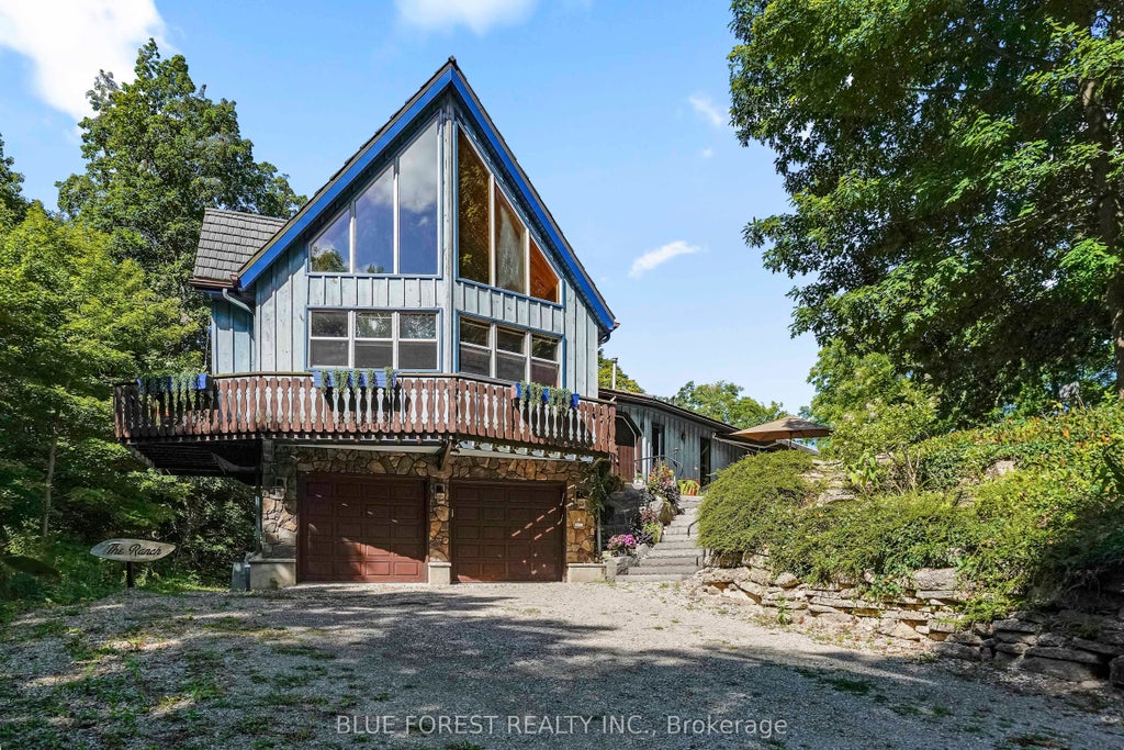 Timber frame Chalet on 93 Acres with Thames River Frontage! Incredible opportunity to own a custom Timber frame Chalet built by the founder of Pineridge Log and Timber frame. (Builders of Cow Bell Brewery in Blyth) Situated on 93 acres with 1000 feet of frontage on the Thames River, this picturesque property offers the perfect blend of natural beauty, privacy, and modern comfort just 3 minutes to Hwy 401 and 20 minutes to London. The home features 3 bedrooms, 2 bathrooms (Cheater Ensuite to Master), Fully finished Walk-Out basement and an attached 2-car garage, all set against a backdrop of 50 workable acres, hardwood forest, and a 1 km private walking trail. Premium features include a shake-style metal roof with a 75-year warranty (installed 2005) and Site sourced 3/4 ash hardwood flooring in the living and dining rooms. The gourmet kitchen includes a walk-in pantry and a dishwasher (2022), overlooking the terrace with a retractable Komoka awning (2020). Oversized 8' Pella patio doors, windows, and skylights fill the space with natural light. Stay cozy year-round with a wood stove as well as a heat-pump furnace with A/C (2023), multi-zoned solar-heated floors (kitchen, foyer, 2 baths, lower bedrooms, and hallway), and 2 owned water heaters. Additional highlights include 200-amp electrical service, exterior roll-up blinds on patio doors, Front and Rear decks, and Antique stained glass accents and fixtures, all in a home that combines energy efficiency with timeless craftsmanship. Whether you're looking for a peaceful retreat, productive farmland, or an outdoor lifestyle property with river access, this one-of-a-kind estate delivers.