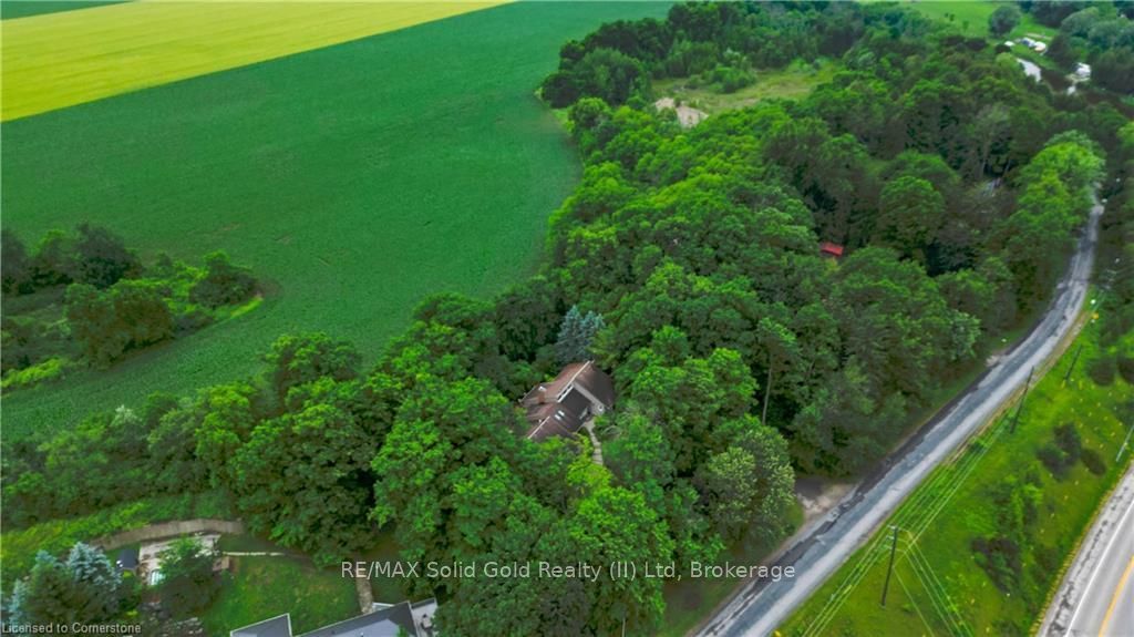 Secluded on 0.75 acres in picturesque West Montrose, this custom-built bungalow offers the perfect balance of privacy and convenience, just minutes from the iconic covered bridge. A wooded hillside wraps the back and sides of the property, creating a natural sanctuary where neighbours are a distant presence. Professionally designed landscaping, fieldstone walkways, and an expansive rear deck provide elegant spaces to enjoy the peaceful setting and abundant wildlife.Inside, warm solid oak flooring flows through the main level, complementing three cozy carpeted bedrooms and two full baths. Cathedral ceilings and a glowing gas fireplace add light and warmth to the living room, while large replacement windows and an updated patio door flood the home with natural light and frame tranquil views. The chefs kitchen, crafted by Caseys, is a culinary showpiece with high-end finishes, gas range, and custom stainless farmhouse sink. The updated main bath features quartz finishes, quality tilework, and an air-jet tub for a spa-like soak.The finished lower level adds exceptional versatility, with a laminate-floored rec room and gas stove, family room, three additional bedrooms/flex spaces, a remodelled 3-piece bath with walk-in shower, and a convenient walk-up to the garageoffering ideal potential for an in-law suite. This home is ideally suited to multigenerational family living.This property is perfectly situated near water activities and the 45-km Kissing Bridge Trail, and is centrally located between Kitchener-Waterloo, Guelph, Elmira, and Fergus-Elorajust 40 minutes from Highway 401. Dont miss the opportunity to experience this private West Montrose retreat!