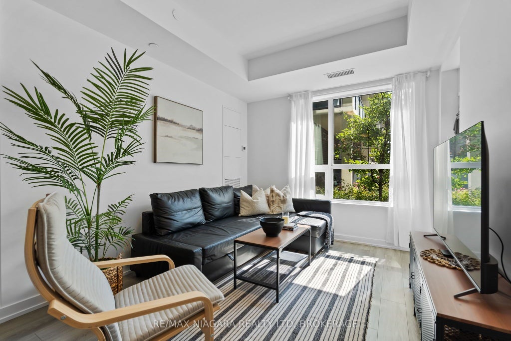 Rare ground-floor corner unit at Utopia Condos featuring 1 bedroom + den (converted to a true second room), 2 full bathrooms, and a private patio with direct courtyard access. Offering the privacy of a detached home with the convenience of condo living, this 690 sq ft home is filled with natural light, a spacious living area, a modern kitchen with ample storage, and in-suite laundry. The primary bedroom features an en-suite and offers courtyard views, while the den, complete with a full wall and door, is ideal as a guest room or office. An oversized locker located right beside the unit, along with 1 underground parking spot, adds unmatched convenience. Enjoy the building's amenities, including a fitness room, rooftop patio, party room, and bike storage. Steps to Sobeys, Dollarama, schools, and parks, with minutes to the QEW and the upcoming GO Station, this is a rare opportunity for professionals, downsizers, or investors seeking modern comfort in a growing community surrounded by vineyards.