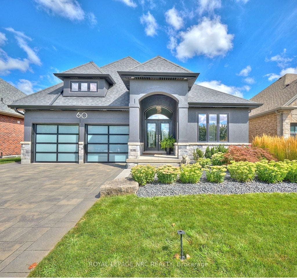 OPPORTUNITY KNOCKS! Rinaldi-built former model bungalow aptly named 'The Remington' and perfectly positioned in Fonthill's Rosewood Estates where every home is a masterpiece of architectural design. From the moment you arrive, it captivates. A sweeping interlocking stone driveway curves through lush, professionally landscaped gardens, kept in flawless emerald perfection by a full irrigation system. The exteriors composition is bold yet gracefulstucco, brick, and stone harmoniously accented by sleek black-framed windows, contemporary glass-panel garage doors, and a rear covered composite deck that whispers of the beauty inside where every detail is a statement. Wood-grain tiled floors with sleek modern doors and trim with upgraded hardware. The open-concept design immediately draws you in to a living space anchored by a built-in floating entertainment unit and crowned with an elegant coffered ceiling suited equally for sophisticated gatherings or quiet evenings at home. The kitchen is a showpiece with gloss cabinetry, striking waterfall-edge quartz island & counters, a dedicated servery with built-in bar fridge, Bosch built-in appliances, and a butlers pantry that makes hosting effortless. The primary suite is pure indulgence: heated ensuite floors, a glass-tiled shower, an opulent soaker tub, dual quartz sinks, and a custom walk-in closet. Step outside to your outdoor paradise curated for relaxation and play. A private putting green invites you to perfect your short game. An outdoor pizza oven transforms al fresco dining into a nightly celebration. Low-maintenance turf ensures flawless greenery year-round and a covered deck extends the season for outdoor enjoyment. On clear nights, the starry sky becomes your personal canopy. When the evening turns cool, enjoy the fully finished lower-level recreation room with inviting gas fireplace, two extra bedrooms, a full 3-piece bath, and generous storage space. Welcome your next chapter here of unparalleled luxury living!