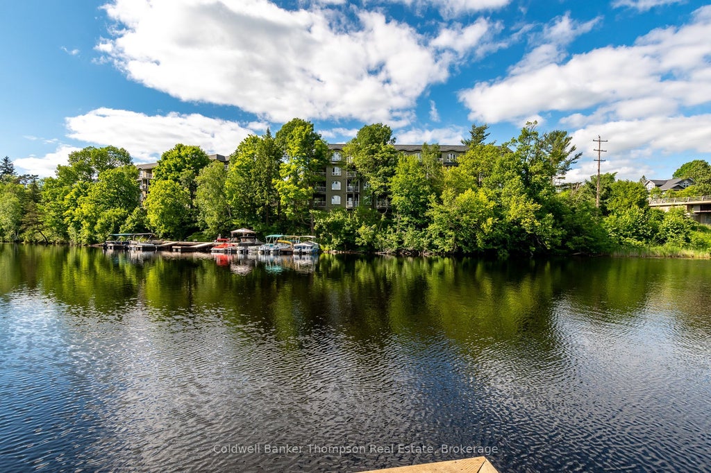 Located in the highly sought-after Algonquin Landing buildings, this beautiful second-floor waterfront condo offers a rare and valuable boat slip, allowing you to keep your boat right in the water at home. With only a few slips available, this is an incredible opportunity. Enjoy access to over 40 miles of boating through the stunning Huntsville lake and waterway system. The building also features a communal dock and waterfront area where all residents can relax, swim, or take in the views. This spacious 1-bedroom plus den condo has been completely updated with gorgeous hardwood flooring and neutral wall colours. The open-concept living, dining, and kitchen area is perfect for entertaining, featuring an updated kitchen with soft-close cabinetry & underlighting, quartz countertops, premium appliances with a built-in microwave, and a reverse osmosis water filtration tap. The renovated bathroom includes modern cabinetry and a step-in shower. With its location on the river side of the building, the condo enjoys southern exposure, filling the space with natural light and warmth. Condo living is made easy with underground heated parking, an elevator to your unit, a convenient garbage chute, a secure key fob entry system, and a storage locker in the basement. Residents can also enjoy the communal BBQ area and the friendly atmosphere of this well-maintained building. Located just across the river and easily accessible for hiking or biking, the popular Hunters Bay Trail adds another layer of outdoor enjoyment to this waterfront lifestyle. A rare opportunity for a waterfront lifestyle with the convenience of condo living!