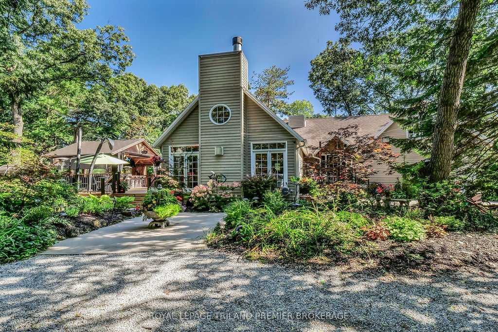 Relax and unwind at your private oasis nestled in the woods! This stunning home is situated on over 3 acres of lush green forestry in desirable Port Franks. Drive up one of the two private winding paths to this updated 1.5 storey home boasting all the amenities for everyday life and play! Enter through the front door into the grand and spacious foyer, through to the sprawling open concept main level featuring great room with hardwood floors, vaulted ceilings, fireplace with stone surround, skylights and access to the large rear deck; updated kitchen loaded with storage, wet bar, granite counter tops, large island with breakfast bar, and direct access to side deck perfect for a serene dinner in the treetops. Lovely main floor primary suite with walk in- closet and updated ensuite including double sinks, granite countertops and tiled shower with glass enclosure. The convenience of mudroom, laundry and 4-piece bathroom complete the main level. Travel up one of the two staircases to the additional 2 bedrooms and generous den/recreation room with fireplace. You can't miss the central outdoor entertainment spot! Boasting large timber framed gazebo (2018) with wet bar, outdoor kitchen, beer taps, ice maker, multiple fridges, TVs, wood burning fireplace, hot tub and sauna you have everything you need to entertain your friends and family all day and night long! Wander down the path to the beautiful 1 bedroom guest house with living room, kitchenette, bathroom, laundry, covered deck, fire pit and parking- the perfect private place for your guests to unwind or to rent out for additional income. Down the path there are 3 storage sheds, space to park a camper, and potentially sever lots. The grand finale is the huge 40'x40' 4-car detached heated garage with 2-piece bathroom (separate septic), 2x30amp service for campers, and 14'x14' garage door perfect to park all of the toys you'll want for exploring beautiful Lake Huron! Steps to beach, community centre, trails and more!