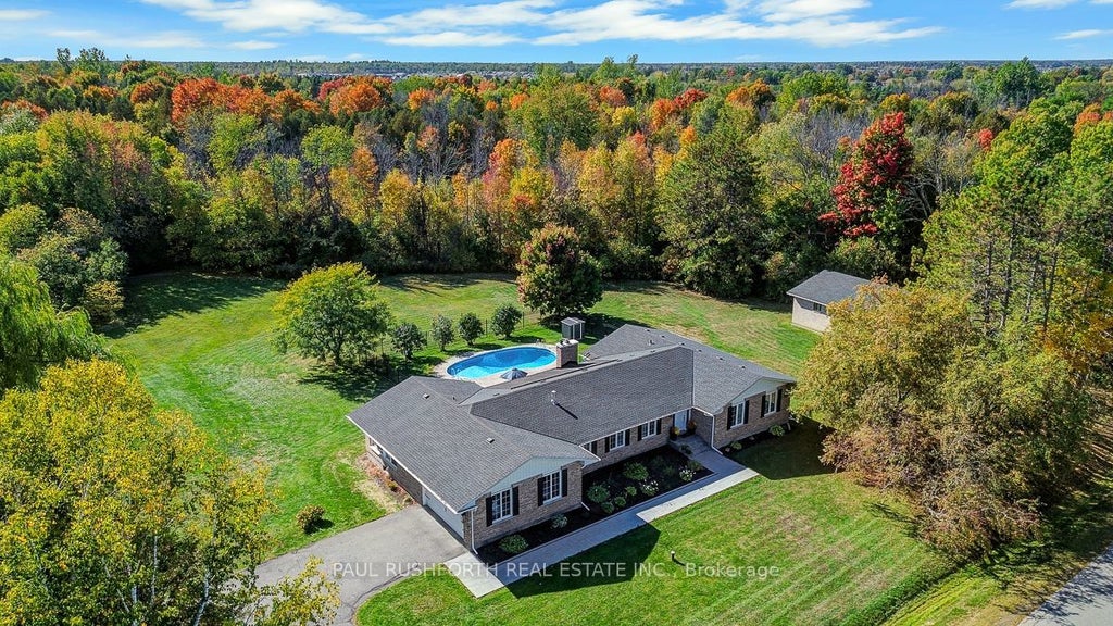 DREAM PROPERTY. SPECTACULAR. High quality STUNNING 2700sqft BUNGALOW on a MAJESTIC 1.7 ACRE treed estate lot in desirable RICHMOND boasting an additional DETACHED TRIPLE GARAGE / WORKSHOP!! PRIVACY & TRANQUILITY in a natural setting mere minutes to amenities. EXTENSIVELY RENOVATED and bursting w/ upgrades & designer finishes. IMPRESSIVE CRAFTSMANSHIP, superb style, open concept layout ideal for everyday living/hosting. FOUR BEDROOMS on MAIN FLOOR + potential for 2 more on lower. This beauty has it all: paved driveway, full brick exterior, in-ground pool, hardwood floors, custom millwork, natural slate flooring, GOURMET CHEF'S KITCHEN with stylish banquet eating area, formal living/dining rooms, mudroom, main floor laundry = ONE LEVEL LIVING! SPRAWLING 4 SEASON SUNROOM (currently used as dining). LAVISH PRINCIPAL RETREAT w. ensuite ABSOLUTELY FABULOUS. OVERSIZED WINDOWS = SUNNY/BRIGHT. Finished lower featuring a lounge, HOME THEATRE, gym (+ space for 5th bedrm/office), 2pc bathroom (w.space for expanding). RESORT STYLE exterior living at its finest: IN-GROUND POOL, fully landscaped, fenced, SPRAWLING DECK & more! 2 CAR ATTACHED GARAGE. BELL/ROGERS HIGHSPEED Available. JUST PERFECT. 200AMP Electrical, Roof 2021, Furnace 2021, Hot water tank 2023. A VERY RARE OPPORTUNITY.