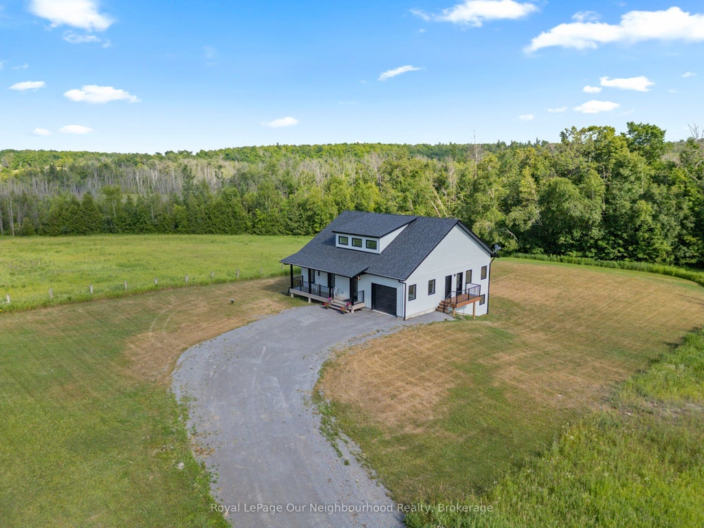 Stylish, spacious, and just a few years young, this quality-built bungaloft offers the perfect blend of modern comfort and country charm. Set on 2 acres, it features open-concept living, vinyl flooring throughout, and tons of natural light from the many windows. The main floor includes a bright kitchen, dining and living area, mudroom with laundry, and a versatile second bedroom with a separate entrance. The primary bedroom is thoughtfully designed with a walk-in closet, 4pc ensuite, and cozy heated floors. Upstairs, you'll find two additional bedrooms and a 4pc washroom, perfect for family or additional guests. The walk-out basement offers endless potential with above-grade windows and rough-ins for a bathroom and kitchenette.