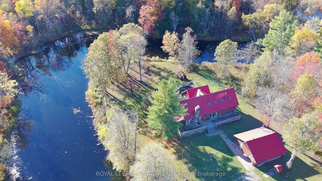 A truly remarkable, handcrafted log home that feels like a luxurious waterfront lodge straight from a movie set! Nestled on just over 2 private acres, this pine-beamed masterpiece features massive log construction, 4 spacious bedrooms, and 3 bathrooms. Unique architectural touches include three staircases and two loft spaces that overlook the expansive kitchen/dining area and the stunning Great Room below. The breathtaking vaulted ceilings soar to 20 feet, enhanced by skylights that flood the space with natural light. This four-season sanctuary also offers a striking stone fireplace, two additional woodstove hookups, beautiful pine plank flooring, and a fully finished basement. With 700 feet of water frontage along the Skootamatta River wrapping around the property, you'll enjoy panoramic views and exceptional privacy. Relax in the fully enclosed sunroom overlooking the inground pool, or take advantage of the detached four-car garage in the process of being re-shingled. An added bonus? A separate 800 sq.ft. living space with open-concept layout, kitchen, laundry, and bathroom, all finished in warm pine and wood tones, ideal for guests, in-law suite, or short term accommodations. Immediate possession available.
