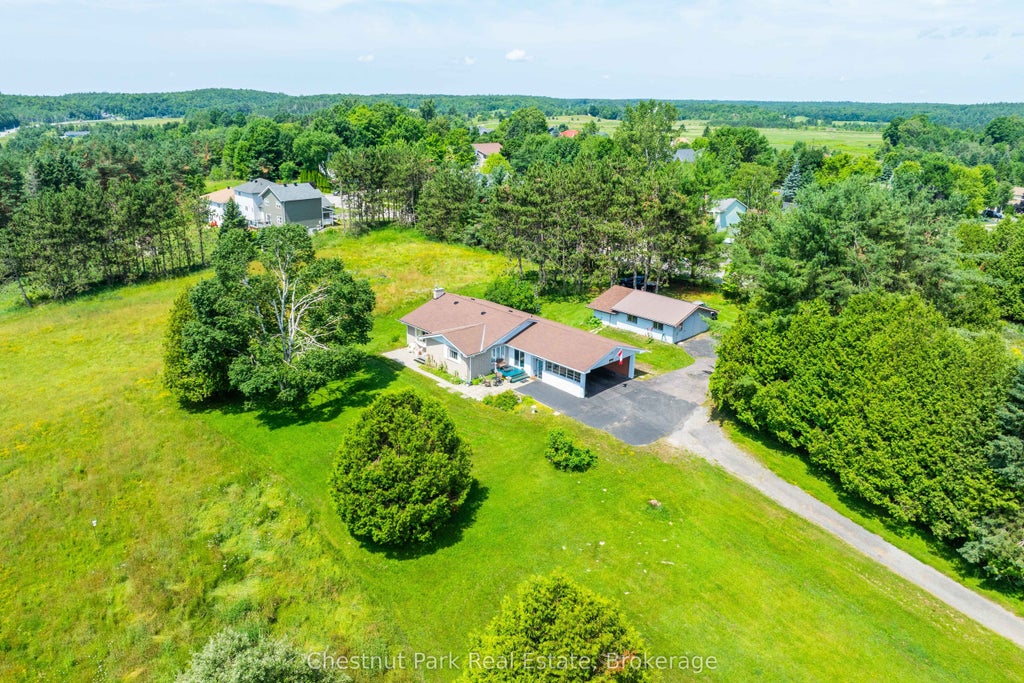 Perched on the west side of Bracebridge with road access to both Hwy 118W and the Covered Bridge subdivision, this 4-acre parcel, a former orchard of the farm that has been in the family for more than 80 years, presents a rare opportunity to own one of the towns most unique and promising properties. Set on a gentle rolling hill sloping south-east, the property offers panoramic, unobstructed views over the treetops of West Bracebridge all the way south to the forested treeline of the Muskoka River, capturing the natural beauty of the Muskoka landscape. With full municipal services available at the north lot line, this in-town location provides the perfect blend of convenience and seclusion. Zoned and located within the Town of Bracebridge, this meticulously cared for property represents a unique convergence of size, location, natural beauty, and servicesall within town boundaries. Properties of this scale and setting rarely come to market, especially those with investment and severance potential offering such a compelling future. The land itself is a picturesque mix of open spaces, manicured lawns, and a blend of professionally maintained shade trees and mature conifers with excellent drainage. At the centre of the property sits a solid, brick, ranch-style bungalow offering approximately 1,500 sq ft of living space, plus a full basement. The home has been lovingly and thoughtfully maintained, including a new furnace powered by natural gas, modern kitchen appliances, updated bathrooms, and enhanced exterior lighting on both the home and large, detached garage. The steel-roofed, windowed garage offers workshop facilities and vehicle storage.