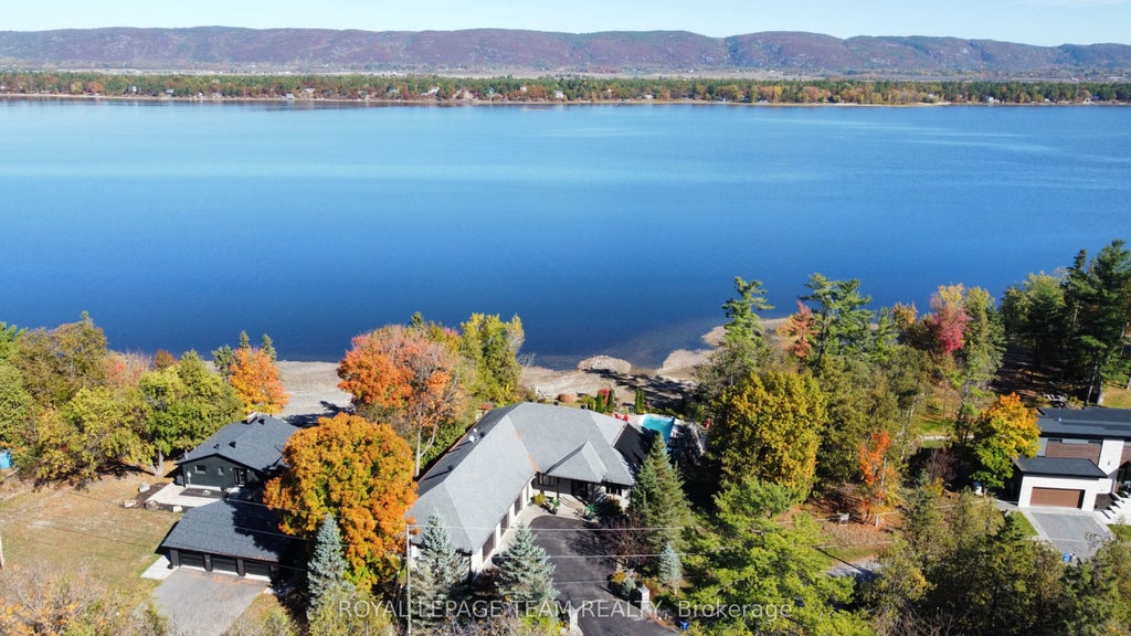This georgeous 5 bedroom, 3 bathroom waterfront home is truly one of a kind. Enter into the foyer and immediately be taken away by the breath taking views of the hills across the stunning waterfront. The foyer opens up to the spectacular living room featuring a fireplace, 2 skylights and 2 large sliding doors leading out to the screened in deck. This grand living room is open to the eat-in kitchen featuring stainless steel appliance, built in wine racks, ample cupboard space and an addition sliding door leading out to the massive deck. On the main level you will also find the incredibly spacious primary bedroom featuring a walk-in closet, 4 piece ensuite, fireplace and additional sliding doors leading out to the deck. This is the perfect couples retreat in your very own home. On the lower level you will find a centrally built wet bar and home theatre, perfect for entertaining, along with addition sitting space, 4 bright bedrooms and a 6 piece bathroom. The 1800 sqft heated garage with high ceilings offers ample storage space and opportunity for car lifts. The most notable part of this one of a kind home is by far the outdoor space. Not only is the screened in deck, massive uncovered deck, and large yard a wonderful space to enjoy all to yourselves or host guests, but the in-ground infinity pool and sandy shore line is every outdoor lovers dream. Enjoy a day of boating on the Ottawa River from your very own private dock. The spectacular waterfront offers prime views of sunrise and sunset all summer long and year round sunsets that are truly remarkable. No detail was missed inside or out in the design of this stunning property. NEW IN 2025 : NEW ULTRA VOILET SYSTEM, REVERSE OSMOSIS SYSTEM, FRIDGE, MICRWAVE, WASHER, DISHWASHER,HEAT PUMPS, POOLCOMPUTER, POWDERROOM TOILET, 3 WATER SOFTNERS - ALL NEW THIS YEAR.
