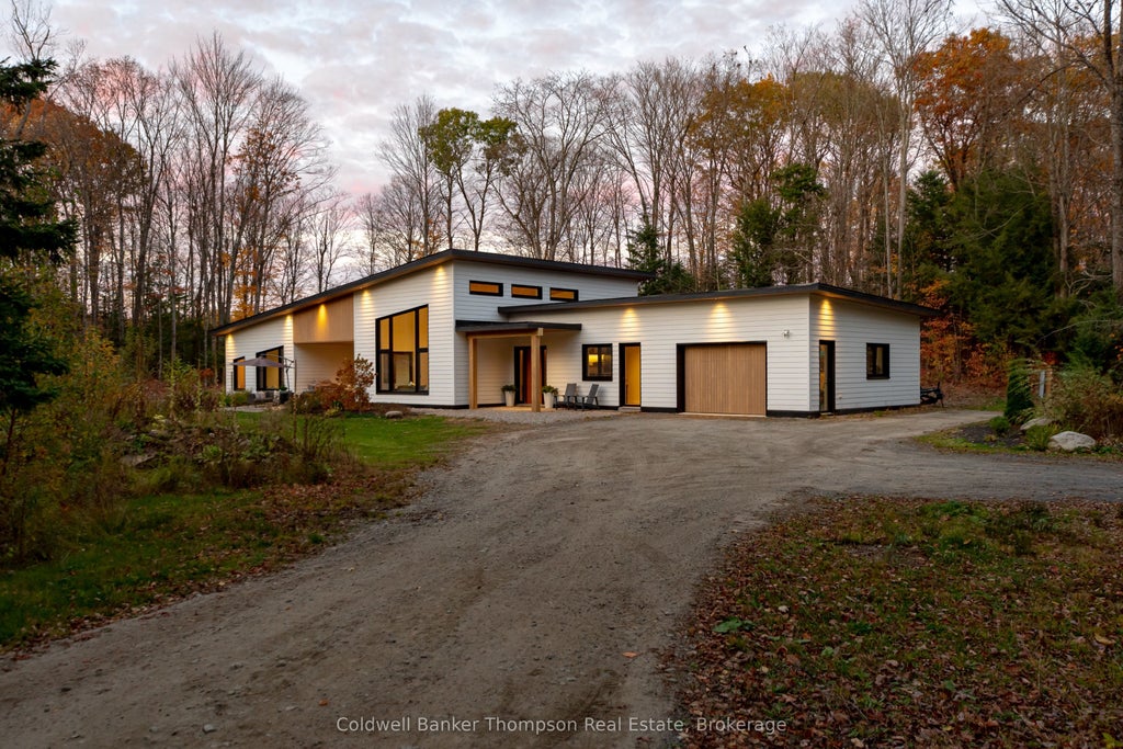 Curated by Thyme Design, renowned for creating healthy living spaces using sustainable practices that reflect Muskoka living & a refined northern aesthetic, this exceptional 3-bed, 2.5-bath bungalow embodies elevated modern luxury. Set on 2.6 acres with 260ft of frontage on a year-round municipally maintained road, the home sits toward the rear of the lot, approached by a meandering driveway offering great privacy. A spacious foyer with a striking wood fluted accent wall opens into the heart of the home, an expansive open-concept living, dining & kitchen area where wood-accented soaring ceilings & warm natural textures create a space both inviting & architecturally striking. The living room opens to a private patio, while the dining area features an elegant bar with dual beverage fridges. The chef's kitchen impresses with a massive island, premium SS appliances & a walk-through butler's pantry connecting to the mudroom, laundry & heated garage. The primary suite features 2 walk-in closets, a wall of west-facing windows & a spa-like 6-pc ensuite with double vanities, a soaker tub & a modern flush double shower. Two additional bedrooms share a stylish 5-pc guest bath. A versatile bonus room with an alcove entry provides extra family space, while a private office with exterior access & 2-pc powder room is ideal for working from home. Attention to detail continues with in-floor heating throughout the home & garage, a hidden 200 sq ft storage room above the kitchen with up to 8-ft ceilings, energy-efficient triple-pane wood aluminum-clad windows from Poland, added insulation, a solar-panel-ready roof, built-in speakers & an impressive suite of smart home features including a Sense Energy Monitoring System, Lutron Caseta switches, Ubiquiti networking, WiFi enabled garage door controller, WiFi controlled in-floor heating & a Dana smart lock. A masterful blend of design integrity, modern comfort & sustainable elegance, this home defines contemporary Muskoka living.